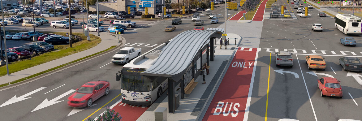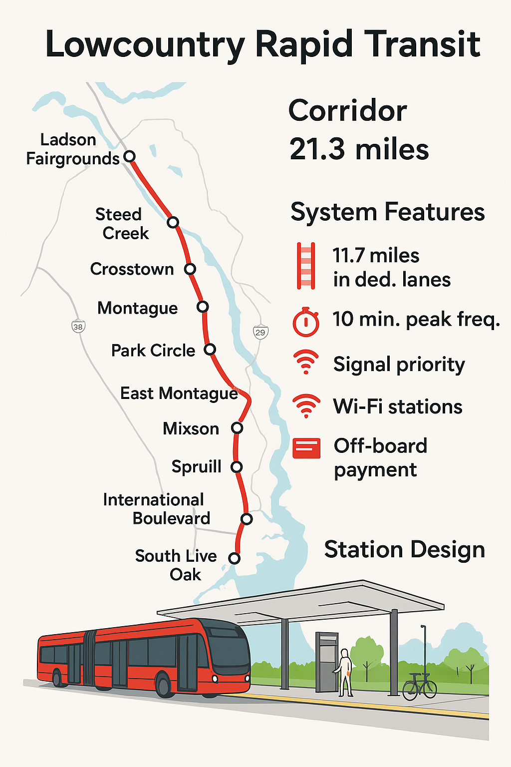 Charleston’s region is actively building the Lowcountry Rapid Transit (LCRT), a modern BRT corridor with dedicated lanes, articulated electric buses, off-board fare collection and frequent service. BRT can deliver near-rail service levels at substantially lower cost and with faster delivery. The LCRT is advancing through engineering and federal approvals now.