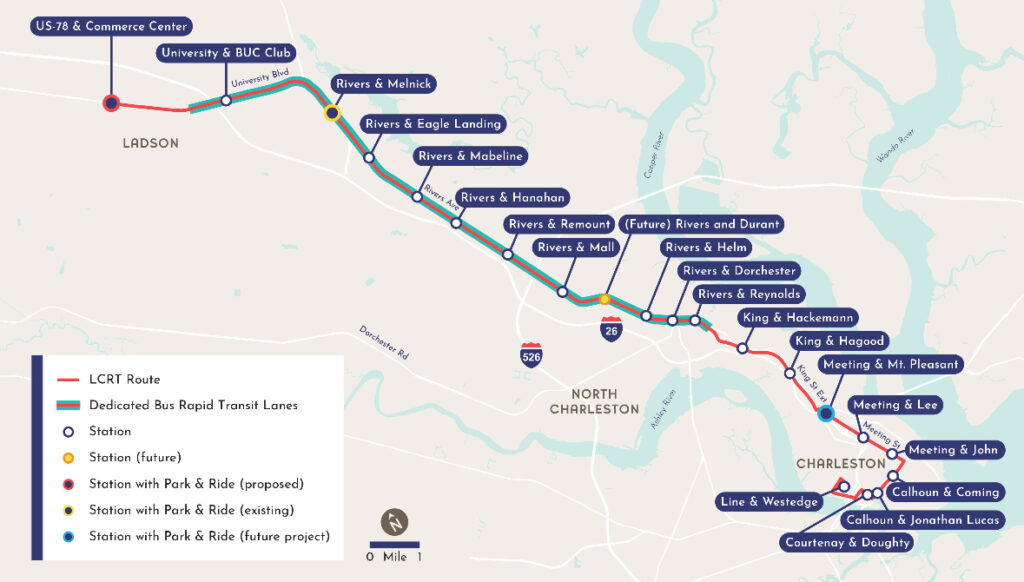 A clear view of the 21.3-mile LCRT route linking Ladson, North Charleston, and Downtown’s WestEdge area. Includes around 20 stations and outlines major neighborhoods and activity centers along Rivers Avenue.