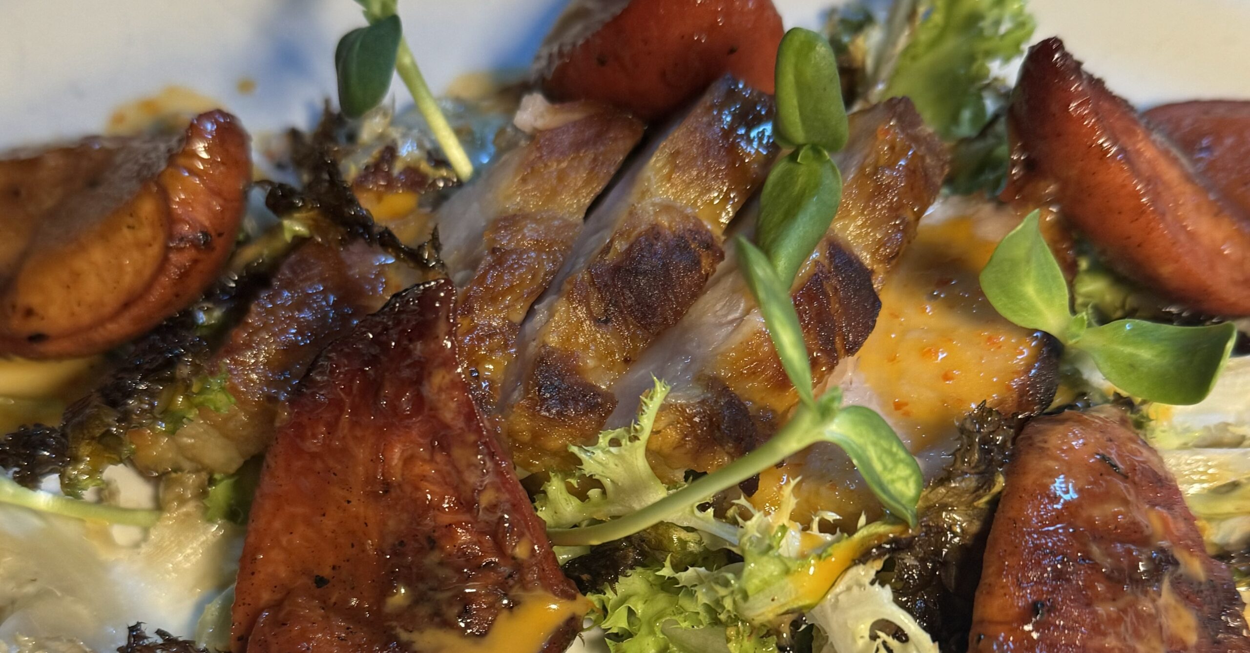 Banner image: Crispy Pork Belly (roasted peaches, grilled escarole, red pepper vin, pickled kumquat)