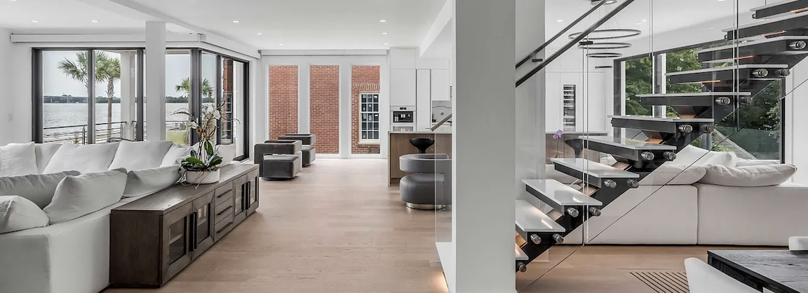 Experience luxurious living in this contemporary style home with incredible direct waterfront views in the vibrant heart of downtown Charleston. Completely renovated and reimagined in 2021 with sophisticated design, this spectacular modern home was built to take advantage of prime views of the Ashley River, Charleston Harbor, the new Battery promenade, and beautiful sunsets. The large floor-to-ceiling windows across the front of the home frame the waterfront as art, while yachts and other boats glide by on the river.