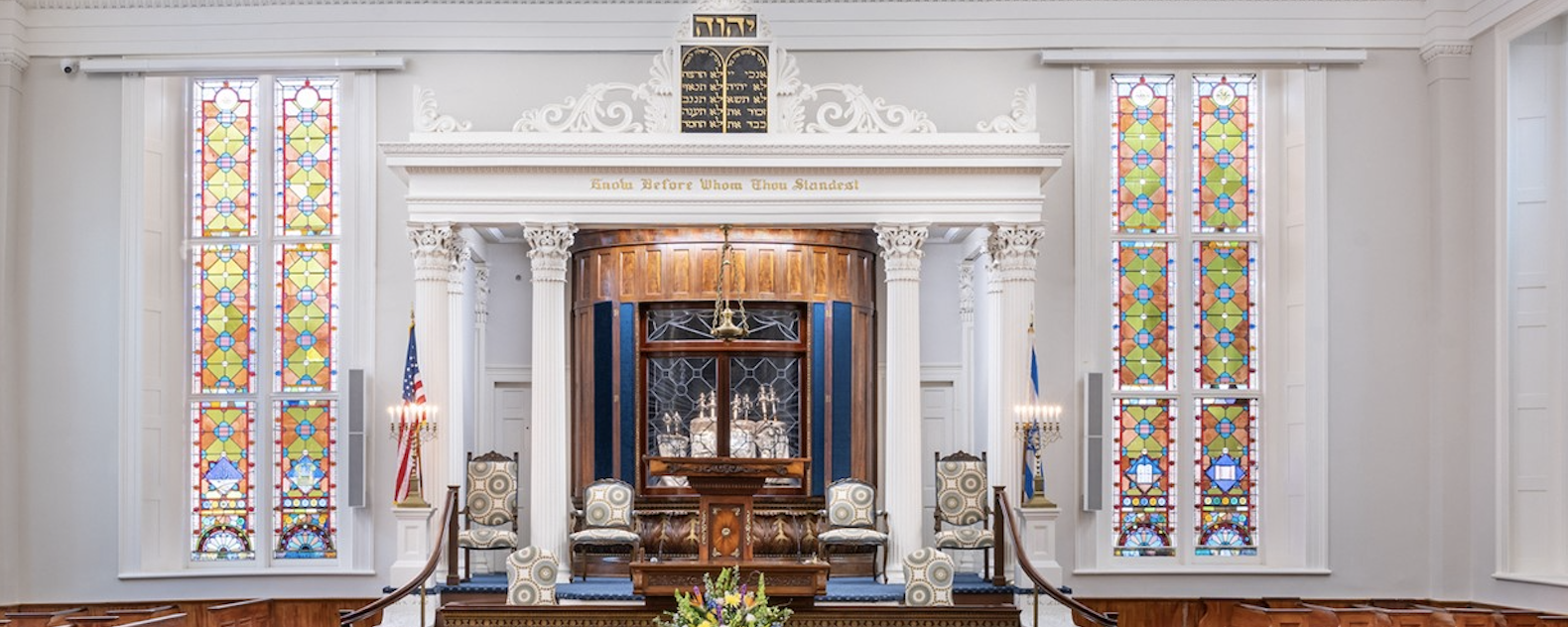 This outstanding Greek Revival style building was constructed in 1840 by member David Lopez from a design by architects Tappan and Noble and work plans by C. L.Warner. It replaces a 1794 cupolated Georgian style structure destroyed by fire in 1838. The temple grounds are fronted by a graceful iron fence dating from the 1794 synagogue. Also surviving are the bases of two menorahs (candelabras) on either side of the Bimah. The large marble tablet above the huge entrance doors proclaims the Sh’ma in Hebrew and an unusual English translation: “Hear O Israel the Lord Our God is the sole Eternal Being.” In the foyer over the entrance to the sanctuary is the original dedication stone from the 1794 synagogue. When our current building was erected in 1840, a controversial organ was installed in the balcony at the rear of the sanctuary. Housing our four Torah scrolls is the massive ark made of Santo Domingo mahogany. The stained glass windows, which show Jewish religious symbols, date from 1886 and are replacements of windows destroyed in the earthquake of that year. The interior of the synagogue, originally following a traditional Sephardic Orthodox arrangement, was altered first in 1879 with the installation of family pews and the removal of the pulpit to the front of the sanctuary. Then, in 1886, after the earthquake, balconies on both sides of the building were removed and the Bimah reconfigured.
