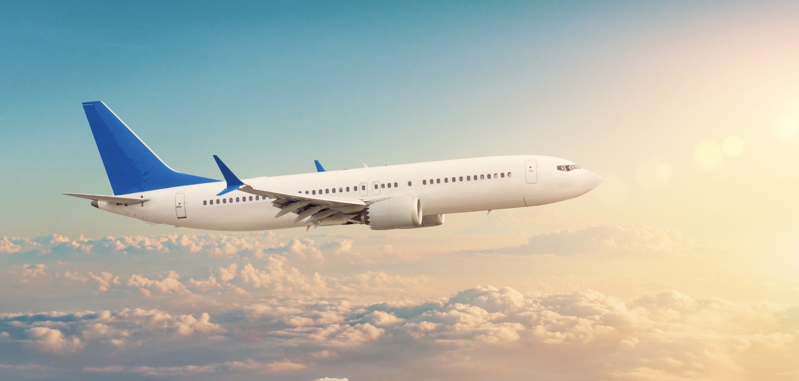 Commercial airplane flying above cloudscape in dramatic toned sunset light.