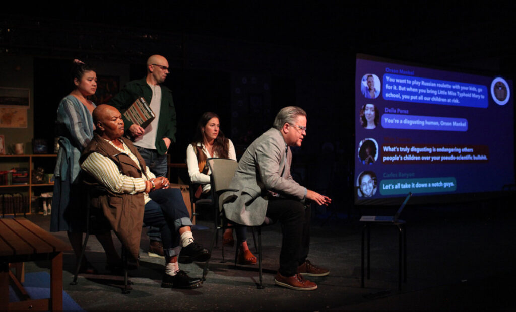 One of the play’s most memorable moments comes in a virtual community forum scene that can only be described as Chaplin meets Lucille Ball meets the Farrelly Brothers. What begins as a sincere attempt at dialogue quickly devolves into chaos — an uproarious, brilliantly choreographed sequence that leaves the audience howling with laughter while squirming in recognition of our shared digital dysfunction.